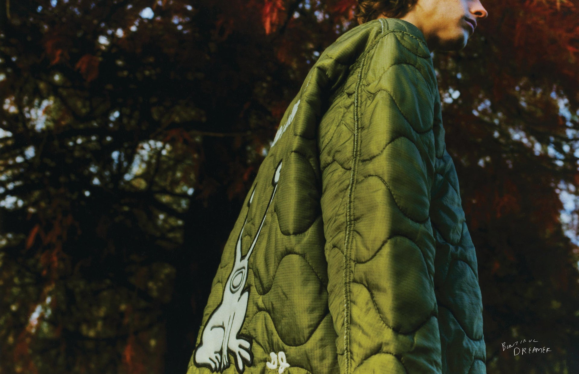 OAMC has developed a six piece collection featuring Daniel Johnston’s artworks. The range includes a padded coach jacket and a bomber jacket in nylon gabardine, a reworked vintage U.S. military surplus M-65 liner, crewneck and hooded sweatshirts in Italian cotton fleece and a short sleeved t-shirt.