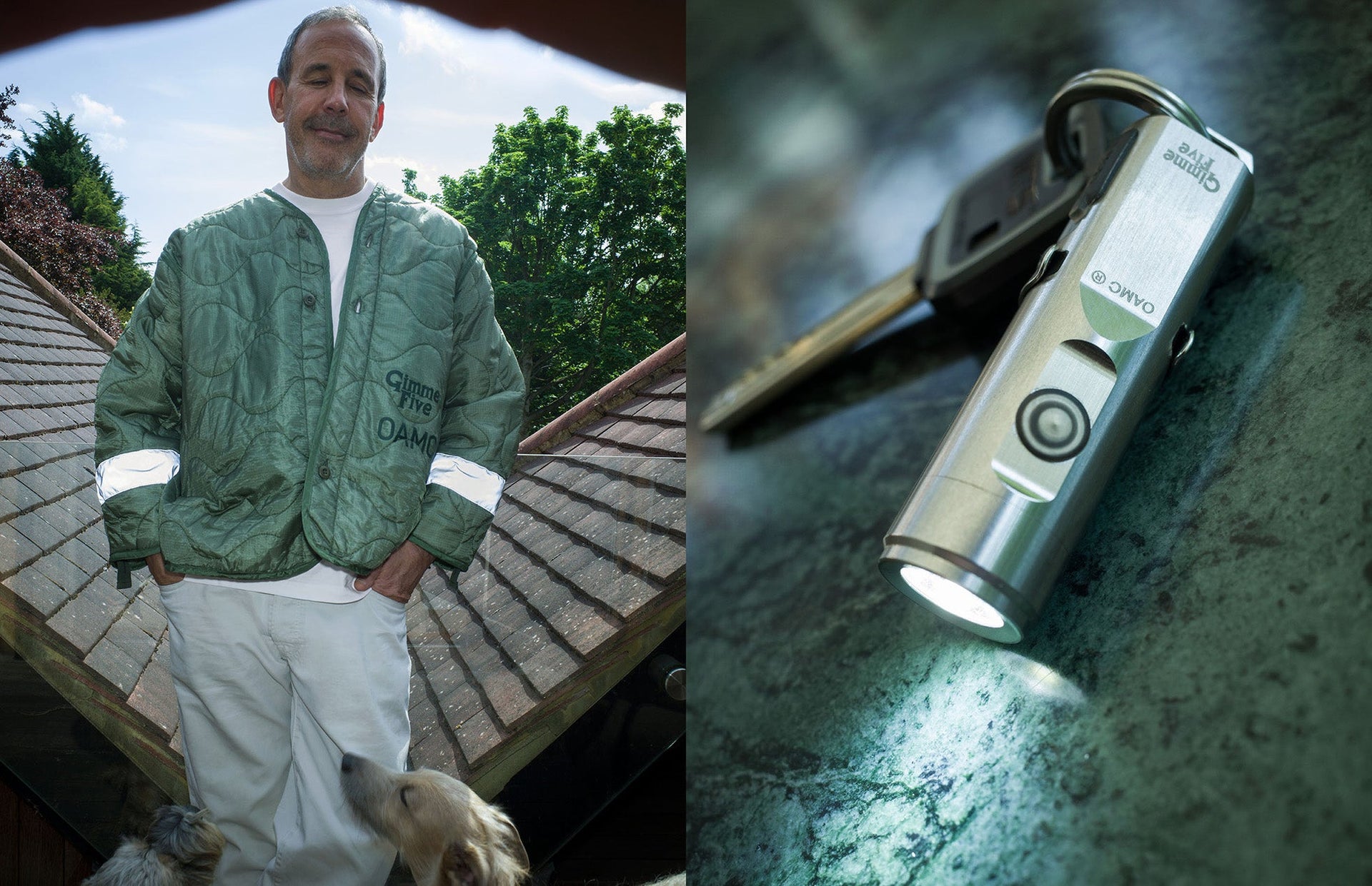 OAMC and Gimme 5 have teamed up and have developed a collaborative Peacemaker liner jacket and a torch. OAMC's signature Peacemaker surplus M-65 quilted liner jacket has been reworked and features applied reflective stripes at the cuffs, both OAMC and Gimme 5 logos at the front as well as the OAMC Peacemaker logo and a custom Gimme 5 artwork at the back. The OAMC x Gimme 5 keychain flashlight is made from stainless steel and is engraved with both OAMC and Gimme 5 logos.