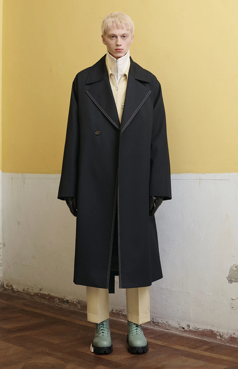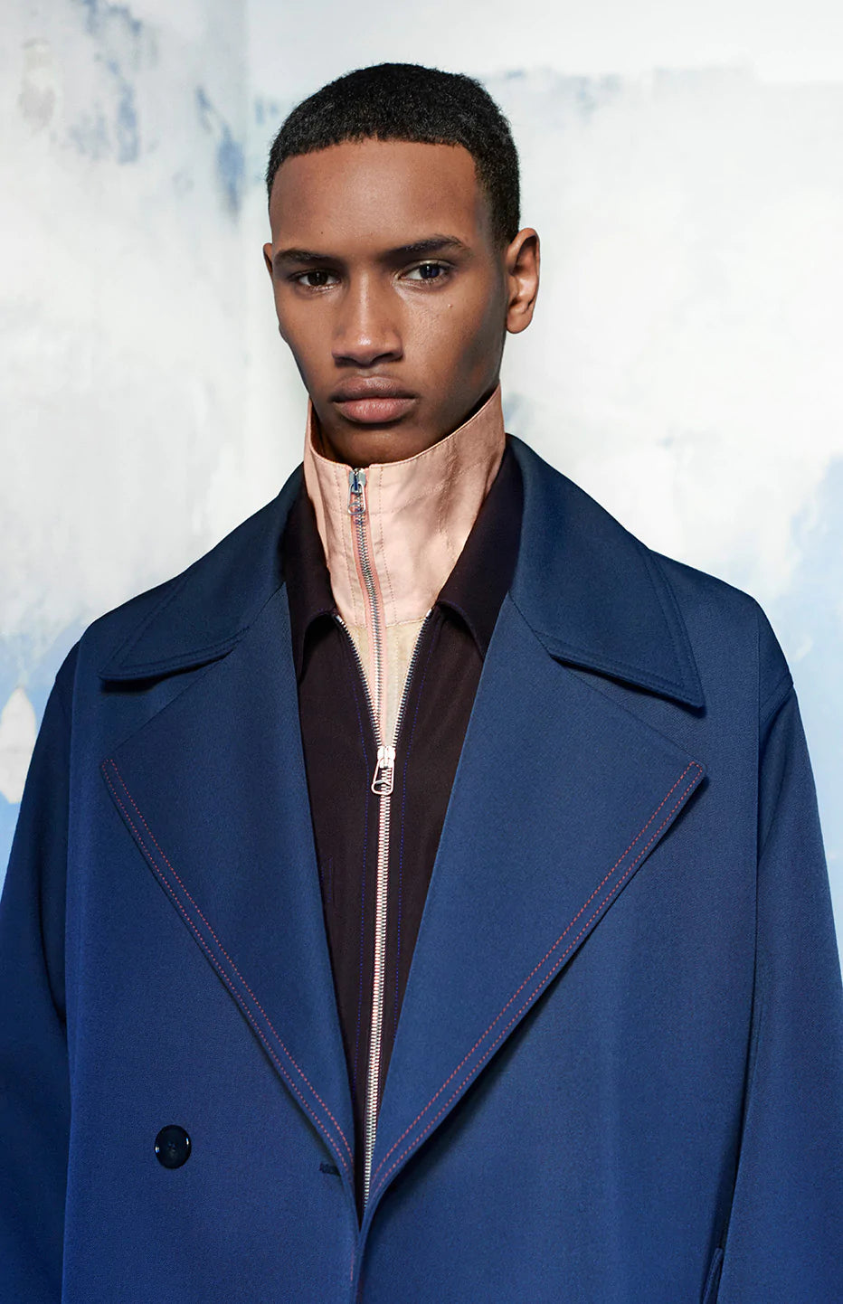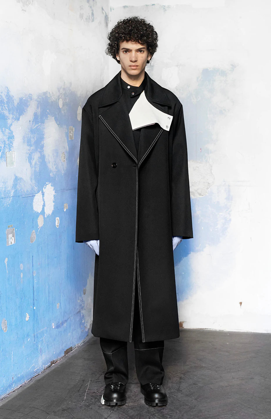 The silhouette is geometric, precise, and angular both in tailoring and pressed workwear shapes. Lines of contrast topstitching reinforce the form at the center front, adding elongation, or framing functional details as pockets and seamwork. Shirt overlaps petal over lapels and front openings, stovepipe stand collars give structure while extending high on the neck. Round, pillowy down coats, with and without utility pocketing, in leather or in recycled nylon, create both comforting softness and substantial volume.