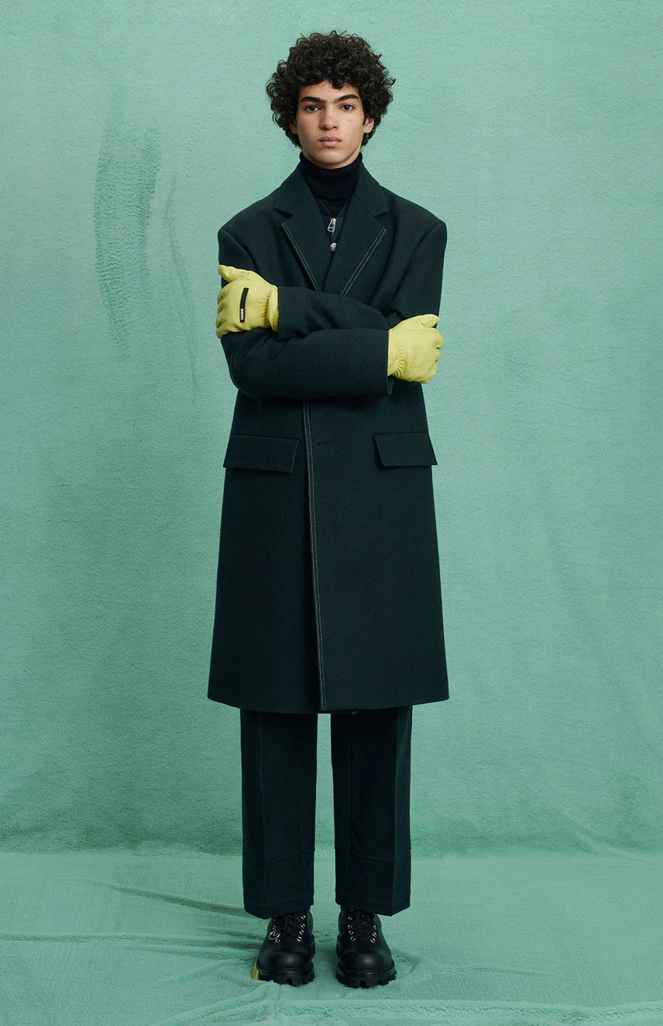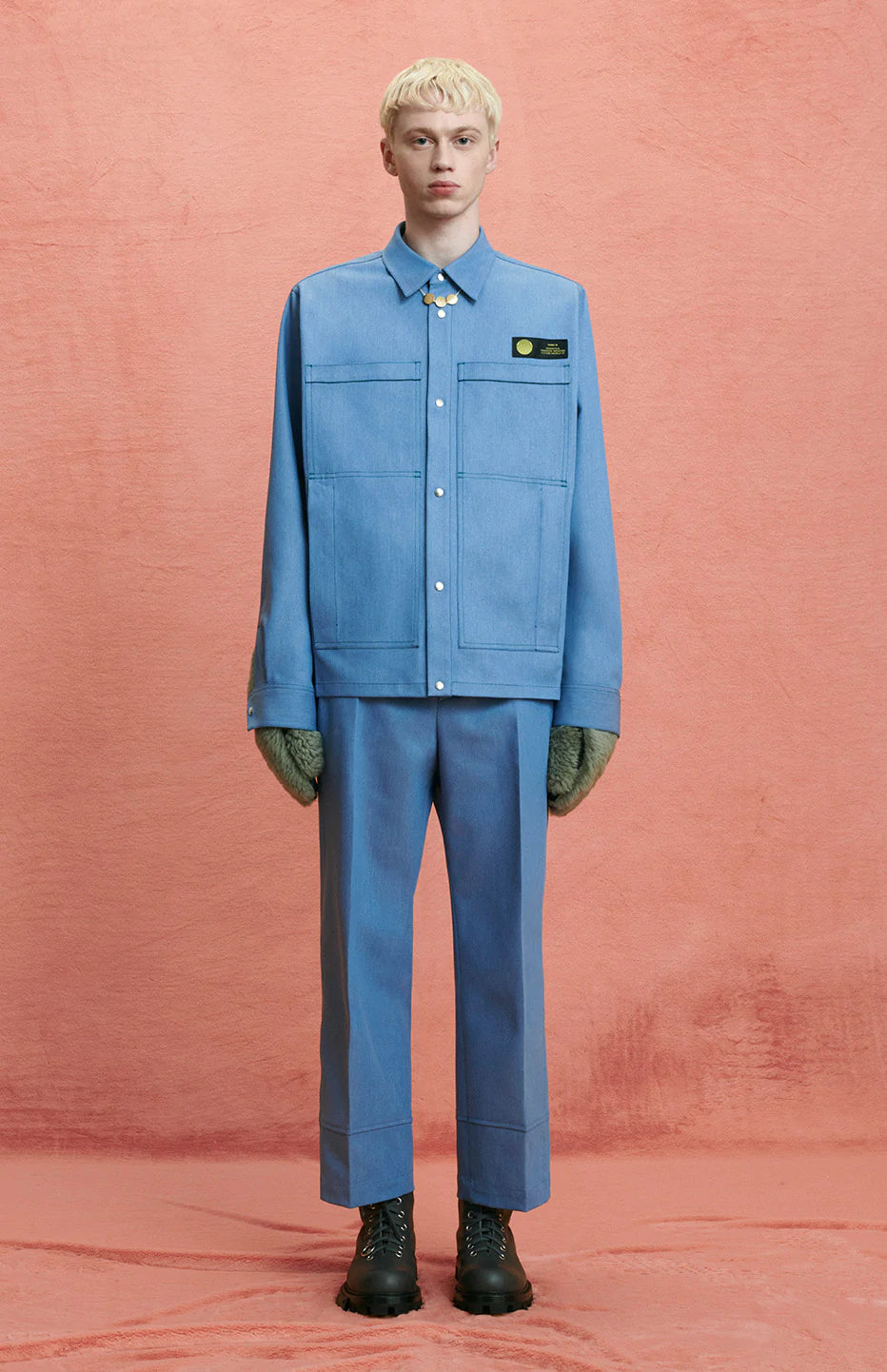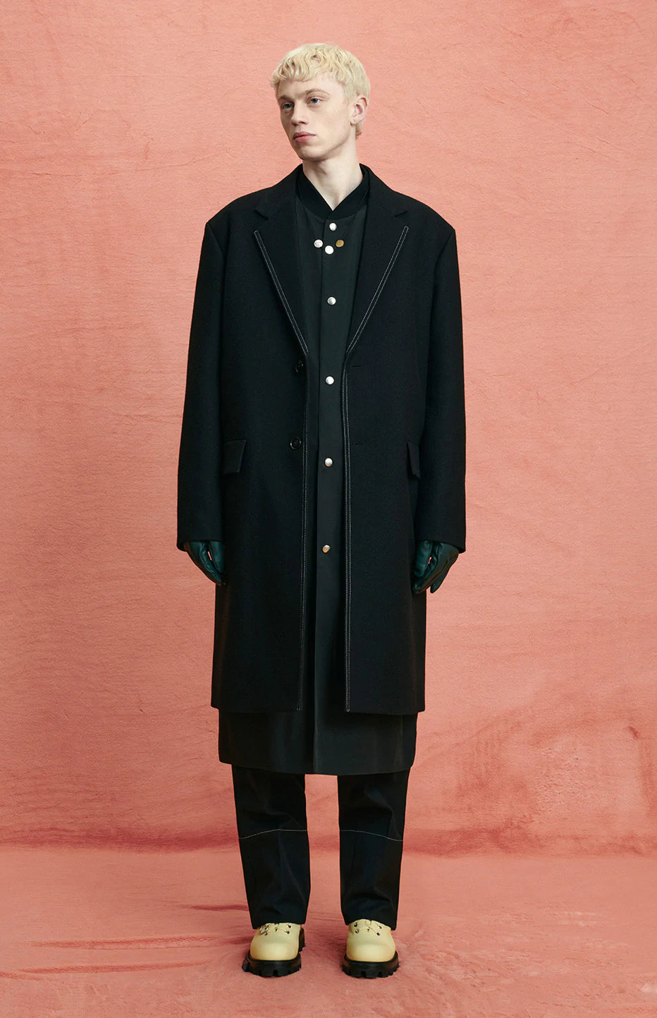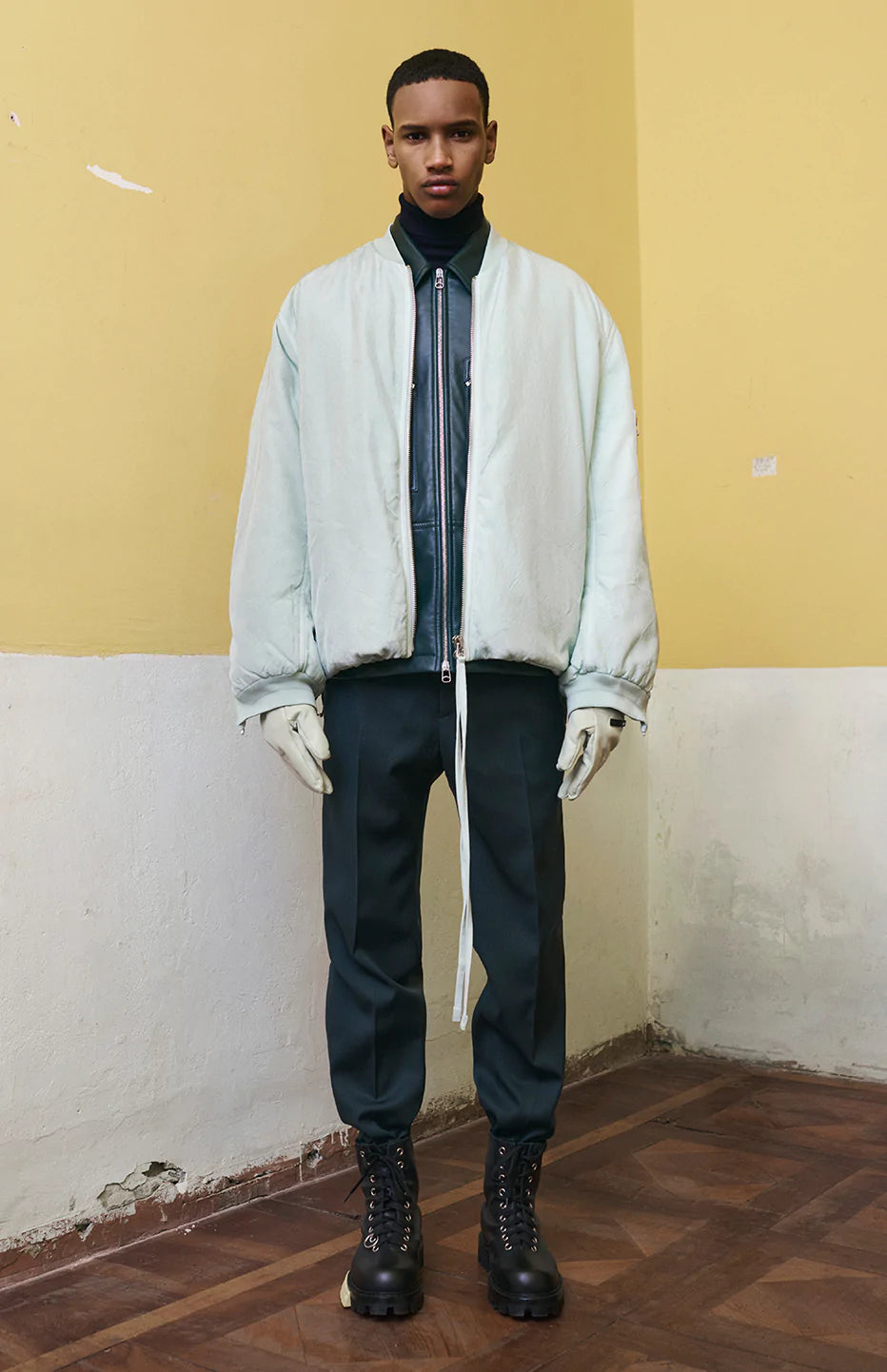 Fabrics are custom developed. Compact felted tailoring wools, spongy double-faced wool with a hammered texture, fluid viscose, quilted printed velvet, strong raw cotton gabardine, garment-dyed recycled nylon sergé and crisp cotton poplin, angular workwear recycled polyester. Soft nappa leather is padded and delicate, and curly shearlings add an inflated feeling to accessories. Boots and shoes are strong-soled, with soft leather uppers and few construction lines: pure, strong forms anchored by OAMC’s contrast outsole clip.