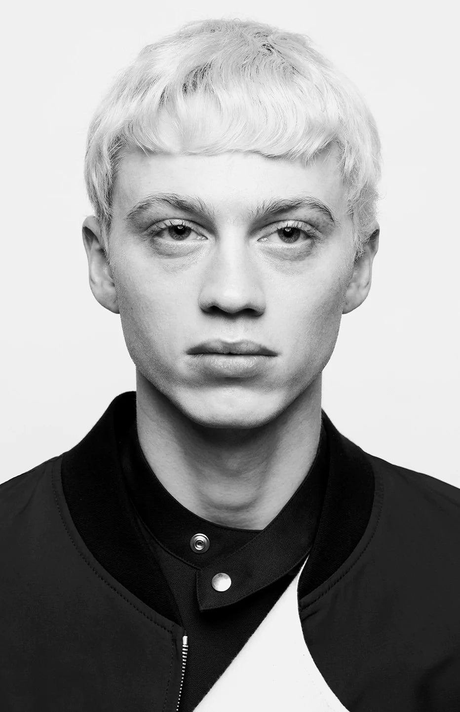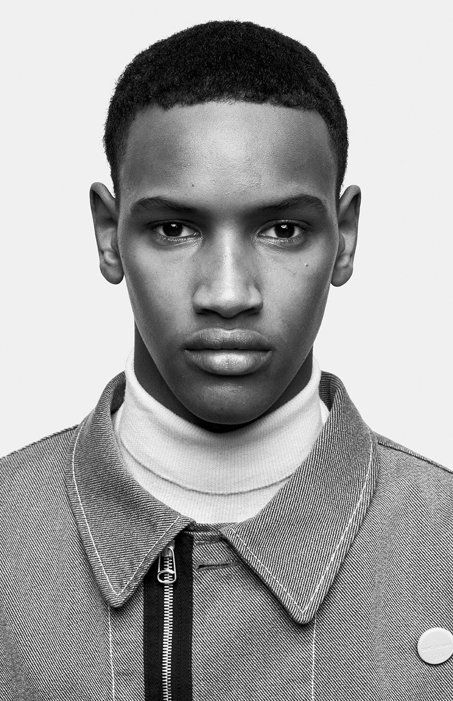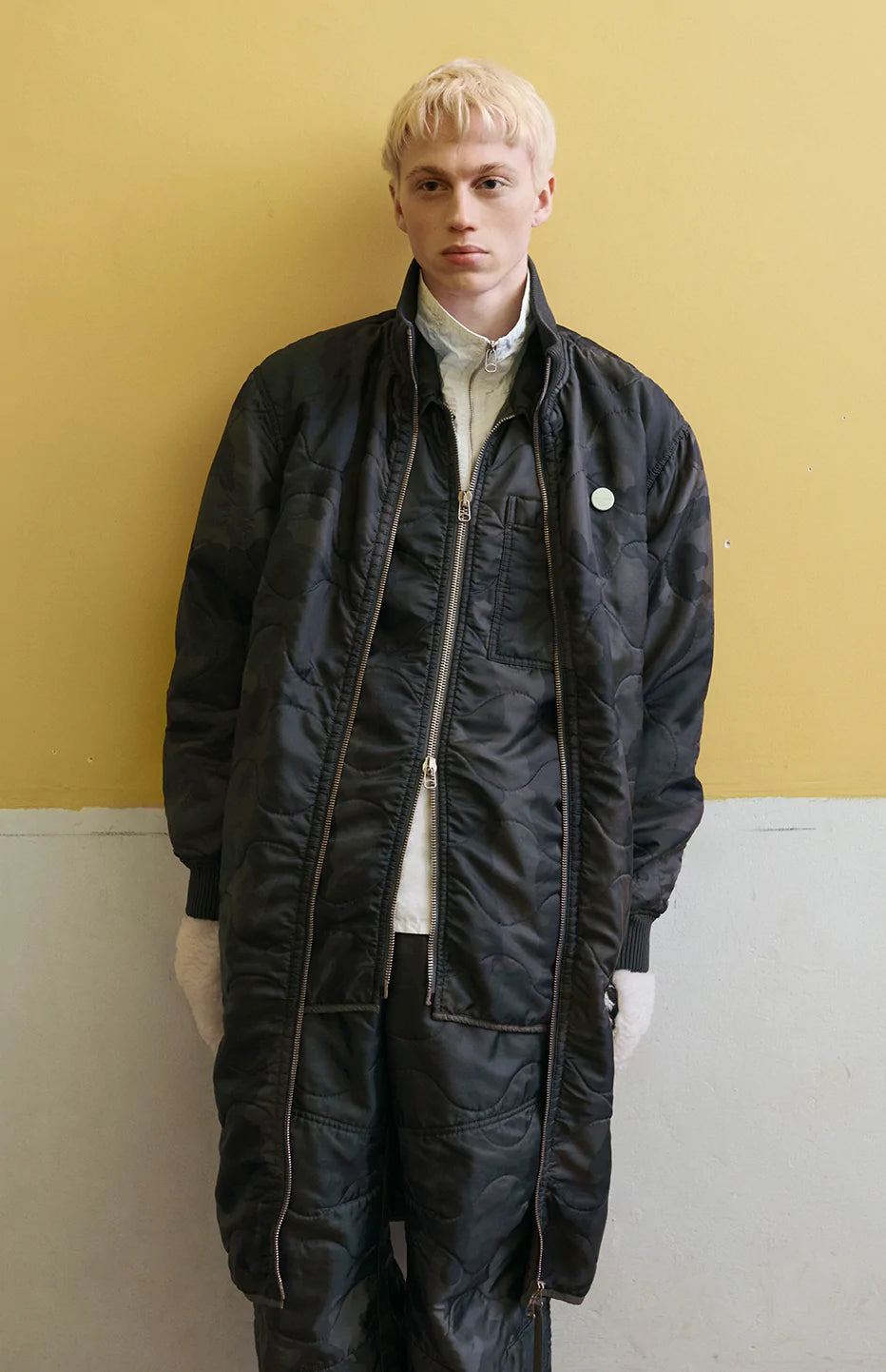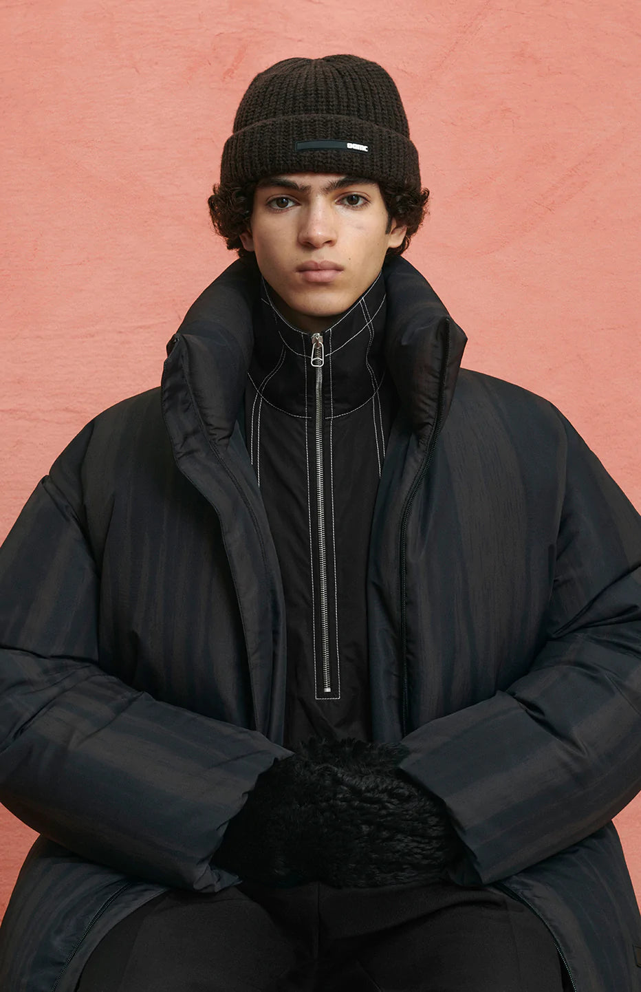 Fabrics are custom developed. Compact felted tailoring wools, spongy double-faced wool with a hammered texture, fluid viscose, quilted printed velvet, strong raw cotton gabardine, garment-dyed recycled nylon sergé and crisp cotton poplin, angular workwear recycled polyester. Soft nappa leather is padded and delicate, and curly shearlings add an inflated feeling to accessories. Boots and shoes are strong-soled, with soft leather uppers and few construction lines: pure, strong forms anchored by OAMC’s contrast outsole clip.