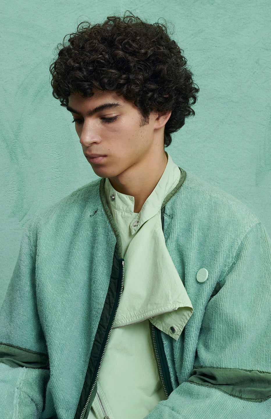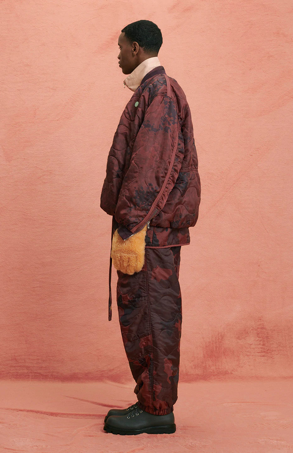 The second season of OAMC Re:Work amplifies the artisanal approach through dye, detail, and shape. There are no standardized patterns as each garment needs to be custom fit and adjusted in accordance to the shape of the original vintage piece. Ready-made items are taken apart, refitted, adjusted, constructed, and overdyed. The exploration of military field jacket liners has a strong presence; lined with wool and overdyed. New garment shapes are created using vintage military blankets printed with camouflage motifs, also overdyed. Wool liners are overdyed and re-shaped, and vintage Swiss military shirts and trousers are re-shaped and overdyed to create relevant forms.