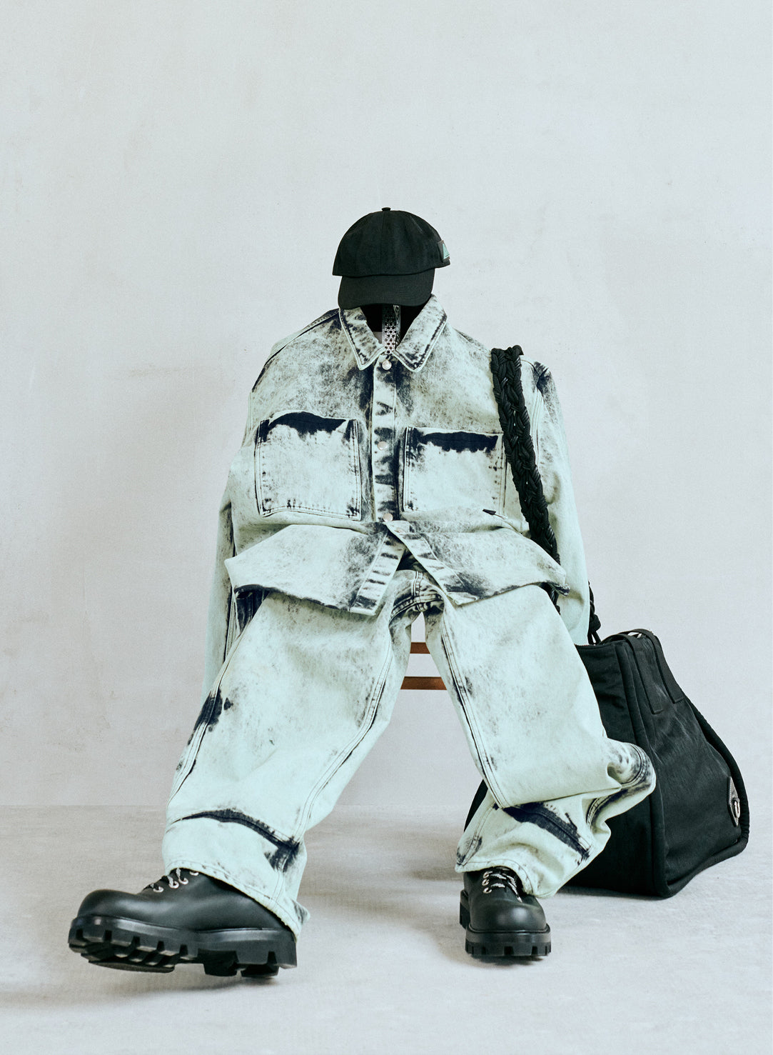 This season denim is introduced into the OAMC collection. The approach was deeply considered from the raw, strong Japanese fabrics to the workmanship and finishings. The result achieved has a warm, West Coast High Sierra climbing feeling while creating a clouded, uneven dye effect. The forms are strong and generous, and have a distinctly hand-made feeling.