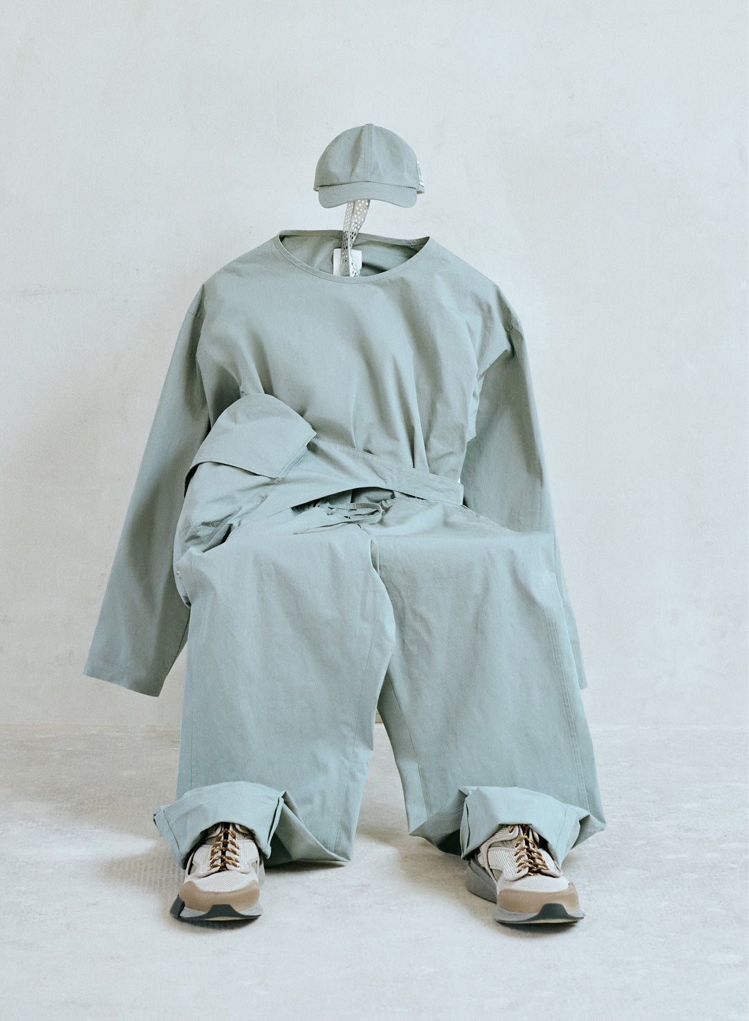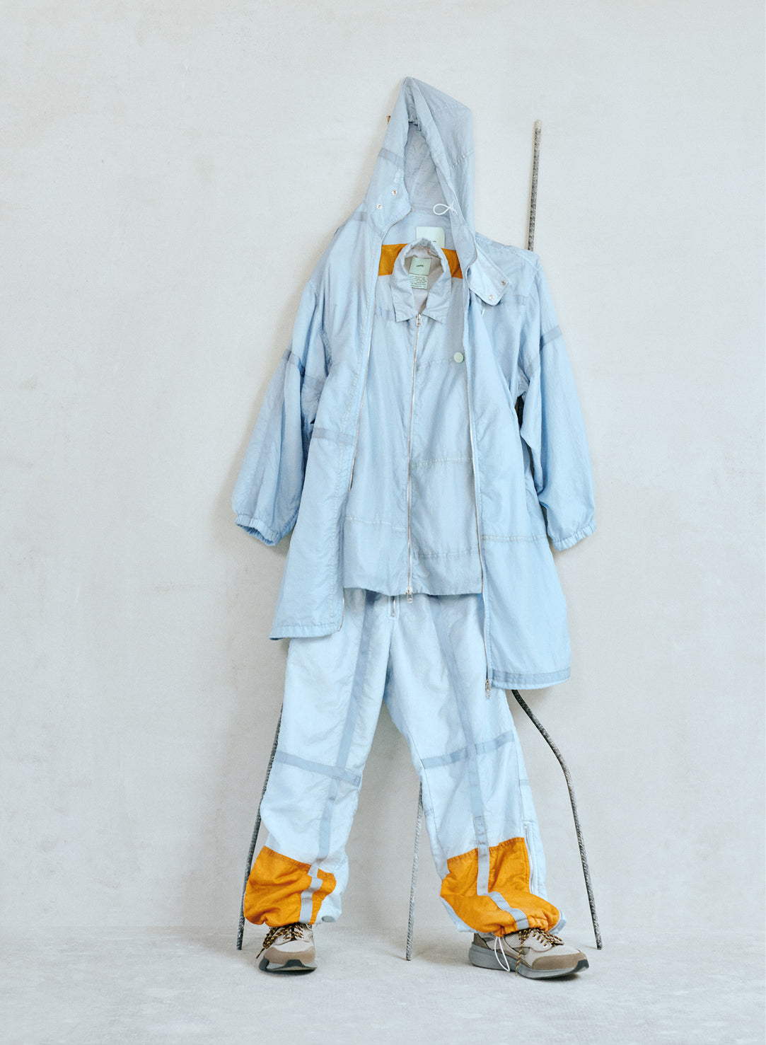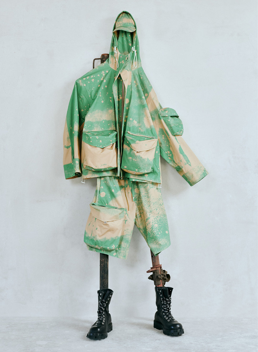 Re:Work is pushed into a more conceptual framework while retaining a functional atmosphere. Alpine flora inspire both the selection of the camouflage motifs as well as the overdyed color palettes. Military garments are again repurposed, dyed, and refinished, both with respect to materials as well as shape. Vintage nylon parachutes are deconstructed, shaped, padded, lined, and overdyed, suggesting a new proposition for working with circular panels and transforming them into garments. Seams are highlighted and left as found: the various people working on these garments at different moments in separate physical locations symbolize a beautiful unity and collaborative effort that seems so lacking in the present world.