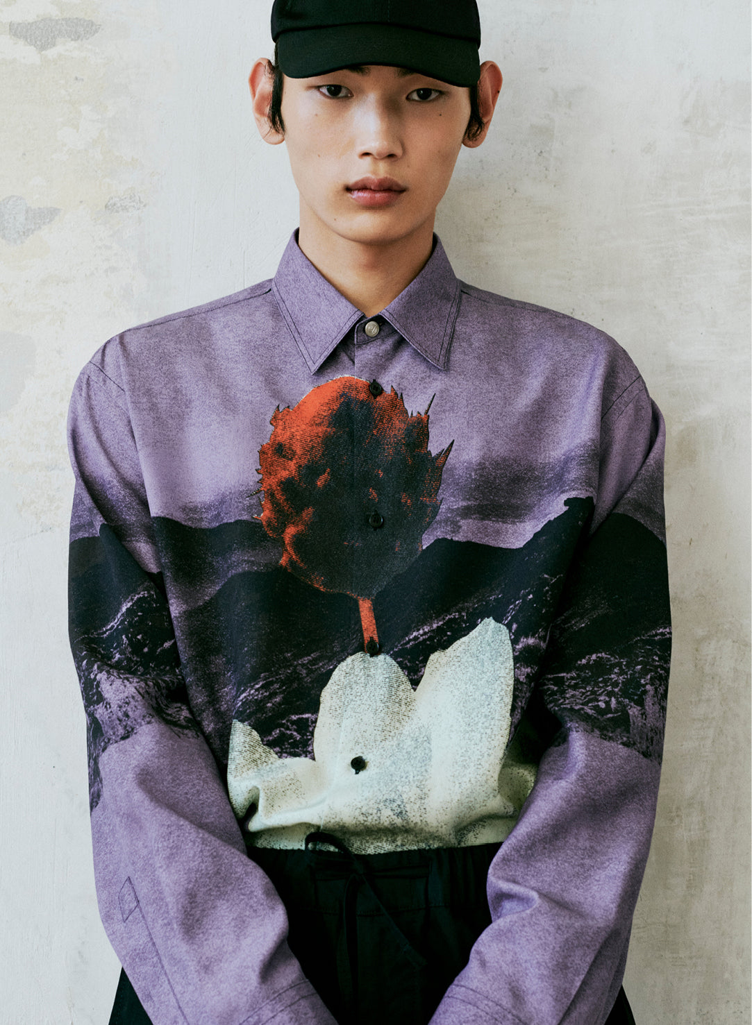 The fabrics in this collection are deeply developed and researched. From coated cotton poplins to strong robust wools in both solid color and mouliné, important advances have also been made in the dye and denim techniques. This season again shows the depth of the artisanal approach with overdye and surface effects applied by hand. Also present are strong singular floral print motifs on fluid viscose/silk shirtings, as well as fully printed garments in crisp cotton, silk, and recycled nylon reminiscent of acid colored marbles. Colors travel from crisp optical whites, creams, and eggshell yellows, to natural hues such as sand, beige, lilac, and pale green, to strong and deep blacks and grey.